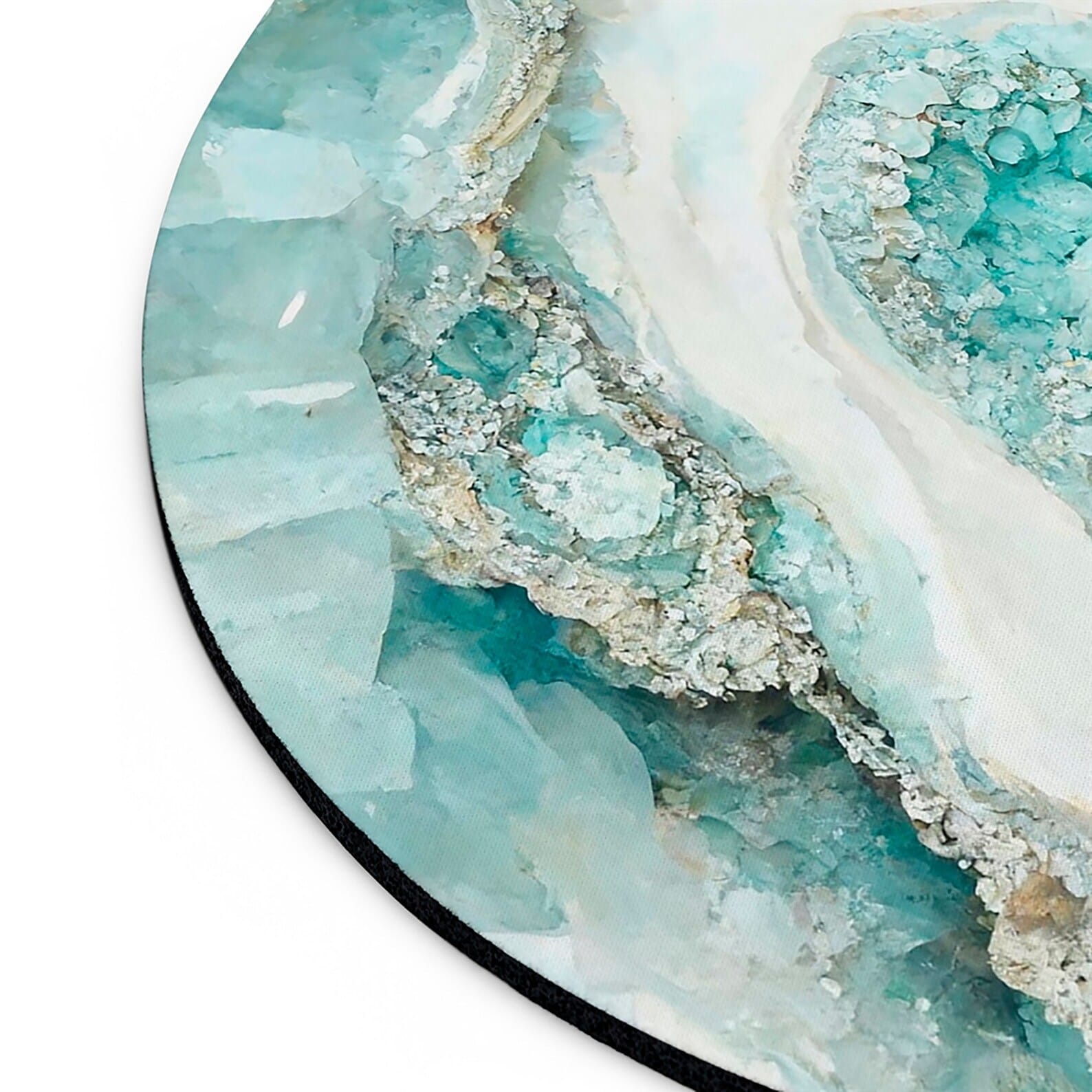 If you're looking to bring some of the earth's innermost glamorous glittery sparkle to your desk top, this Aquamarine Geode Crystal Art Round Mouse Pad can provide. Practical and stunning, the neoprene construction has a non-slip rubber bottom.