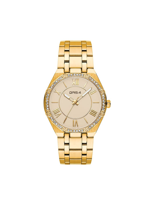 DAS.4 Γυναικείο Αναλογικό Ρολόι 2031100141, με σαμπανί καντράν στολισμένο γύρω με λευκά ζιργκόν. Οι ενδείξεις τις ώρας απεικονίζονται με λατινικούς αριθμούς και το μπρασελέ του είναι από ανοξείδωτο ατσάλι σε κίτρινο χρυσό επιμετάλλωση, DAS.4.