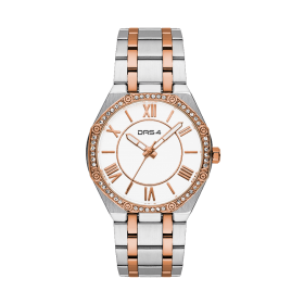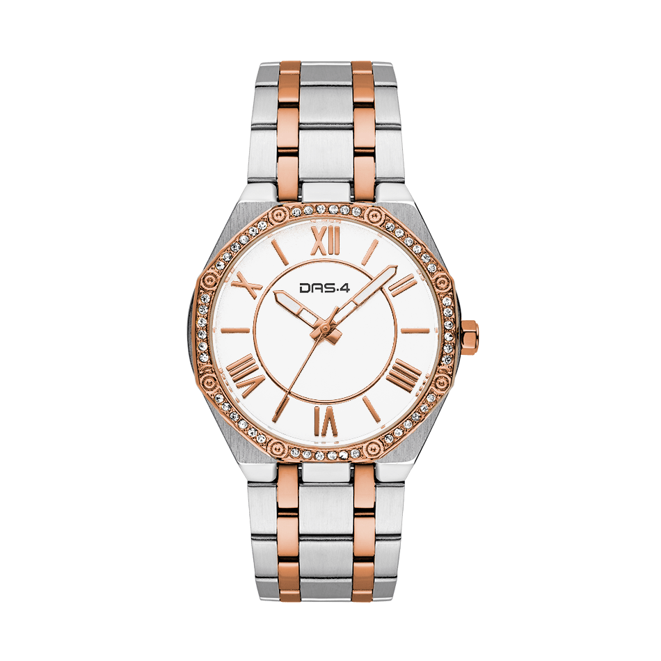 DAS.4 Γυναικείο Αναλογικό Ρολόι 2031100171, με ασημί καντράν στολισμένο γύρω με λευκά ζιργκόν. Οι ενδείξεις τις ώρας απεικονίζονται με λατινικούς αριθμούς και το δίχρωμο μπρασελέ του είναι από ανοξείδωτο ατσάλι με ροζ χρυσό επιμετάλλωση, DAS.4.