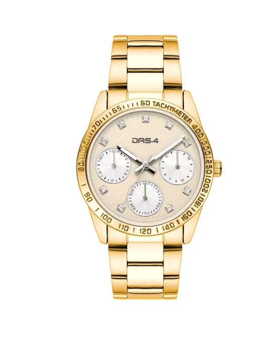 DAS.4 Γυναικείο Αναλογικό Ρολόι 2031100541, με σαμπανί χρώμα καντράν και μπρασελέ από ανοξείδωτο ατσάλι σε κίτρινο χρυσό επιμετάλλωση. Στο εσωτερικό μέρος του καντράν υπάρχουν ξεχωριστές ενδείξεις Ημέρας, Ημερομηνίας και 24ωρης ώρας, σε λευκό φίλντισι καθώς και λευκά ζιργκόν στις ενδείξεις τις ώρας, DAS.4.