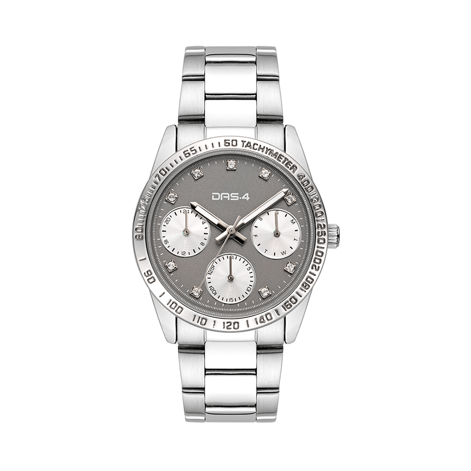 DAS.4 Γυναικείο Αναλογικό Ρολόι 2031100581, με γκρι χρώμα καντράν και μπρασελέ από ανοξείδωτο ατσάλι σε ασημί χρώμα. Στο εσωτερικό μέρος του καντράν υπάρχουν ξεχωριστές ενδείξεις Ημέρας, Ημερομηνίας και 24ωρης ώρας, σε λευκό φίλντισι καθώς και λευκά ζιργκόν στις ενδείξεις τις ώρας, DAS.4.
