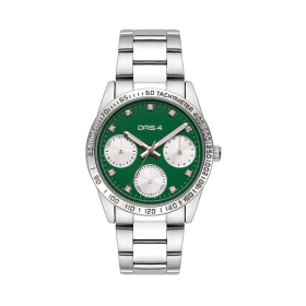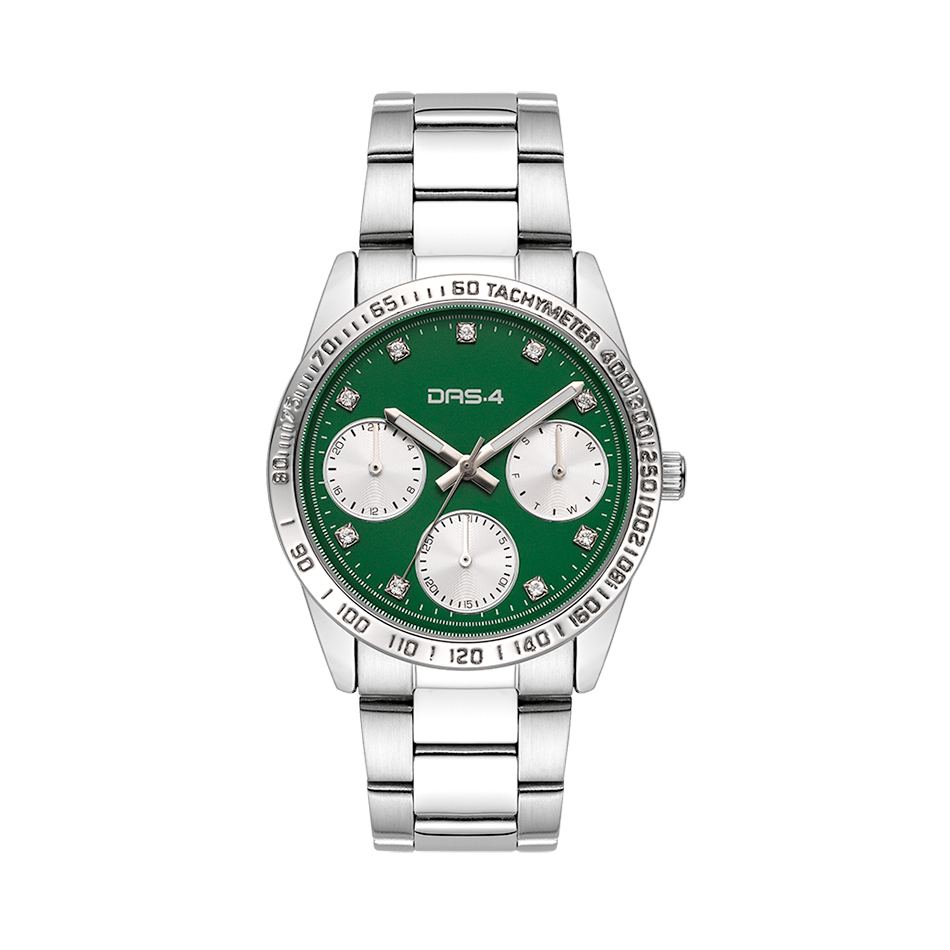 DAS.4 Γυναικείο Αναλογικό Ρολόι 2031100582, με πράσινο χρώμα καντράν και μπρασελέ από ανοξείδωτο ατσάλι σε ασημί χρώμα. Στο εσωτερικό μέρος του καντράν υπάρχουν ξεχωριστές ενδείξεις Ημέρας, Ημερομηνίας και 24ωρης ώρας, σε λευκό φίλντισι καθώς και λευκά ζιργκόν στις ενδείξεις τις ώρας, DAS.4.