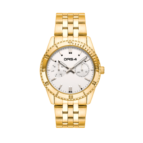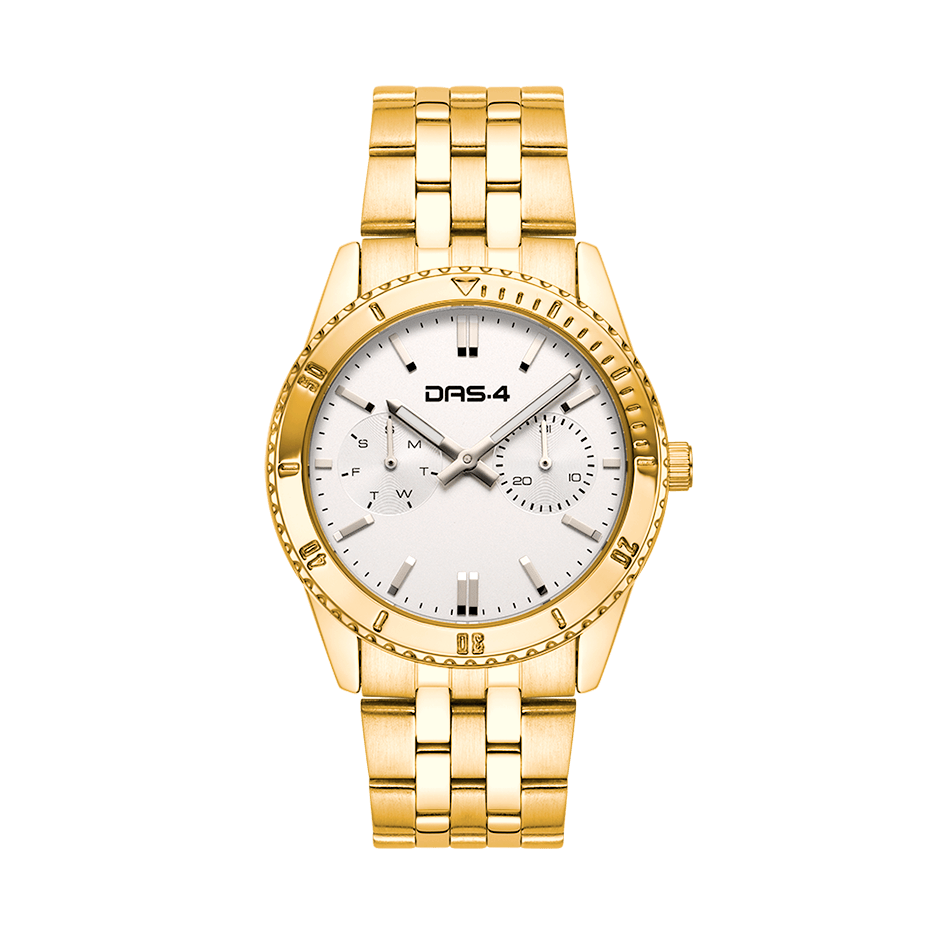 DAS.4 Γυναικείο Αναλογικό Ρολόι 2031100641, με ασημί χρώμα καντράν και μπρασελέ από ανοξείδωτο ατσάλι σε κίτρινο χρυσό επιμετάλλωση. Στο εσωτερικό μέρος του καντράν υπάρχουν ξεχωριστές ενδείξεις Ημέρας και Ημερομηνίας σε λευκό πλαίσιο, DAS.4.