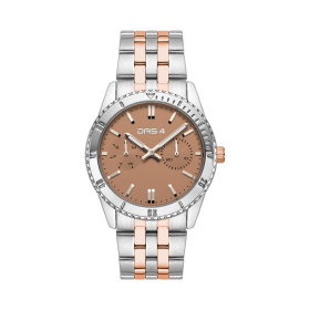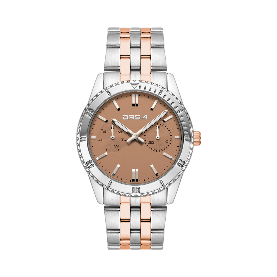 DAS.4 Γυναικείο Αναλογικό Ρολόι 2031100671, με καφέ χρώμα καντράν και δίχρωμο μπρασελέ από ανοξείδωτο ατσάλι με ροζ χρυσό επιμετάλλωση. Στο εσωτερικό μέρος του καντράν υπάρχουν ξεχωριστές ενδείξεις Ημέρας και Ημερομηνίας σε καφέ πλαίσιο, DAS.4.