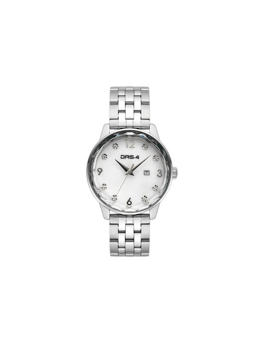 DAS.4 Γυναικείο Αναλογικό Ρολόι 2031100781, με λευκό φίλντισι καντράν και μπρασελέ από ανοξείδωτο ατσάλι σε ασημί χρώμα. Στο εσωτερικό μέρος του καντράν υπάρχει ξεχωριστή ένδειξη Ημερομηνίας και οι κεντρικές ενδείξεις της ώρα απεικονίζονται με αριθμούς, ενώ οι υπόλοιπες με ζιργκόν, DAS.4.