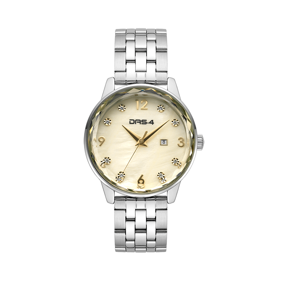 DAS.4 Γυναικείο Αναλογικό Ρολόι 2031100782, με σαμπανί φίλντισι καντράν και μπρασελέ από ανοξείδωτο ατσάλι σε ασημί χρώμα. Στο εσωτερικό μέρος του καντράν υπάρχει ξεχωριστή ένδειξη Ημερομηνίας και οι κεντρικές ενδείξεις της ώρα απεικονίζονται με αριθμούς, ενώ οι υπόλοιπες με ζιργκόν, DAS.4.
