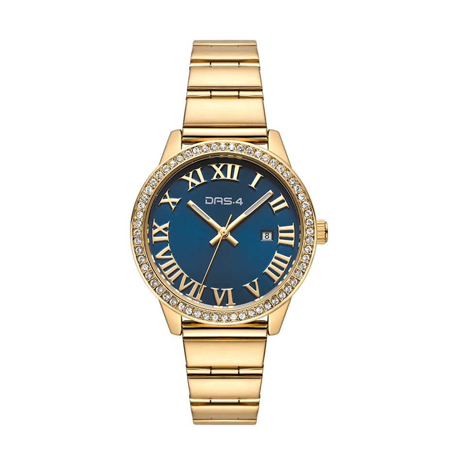 DAS.4 Γυναικείο Αναλογικό Ρολόι 2031100941, με navy μπλε καντράν και στολισμένη κίτρινη χρυσή κάσα με λευκά ζιργκόν. Στο καντράν του, οι ενδείξεις τις ώρας απεικονίζονται με λατινικούς αριθμούς, ενώ υπάρχει ξεχωριστή ένδειξη της ημερομηνίας, και το μπρασελέ του είναι από ανοξείδωτο ατσάλι σε κίτρινο χρυσό επιμετάλλωση, DAS.4.