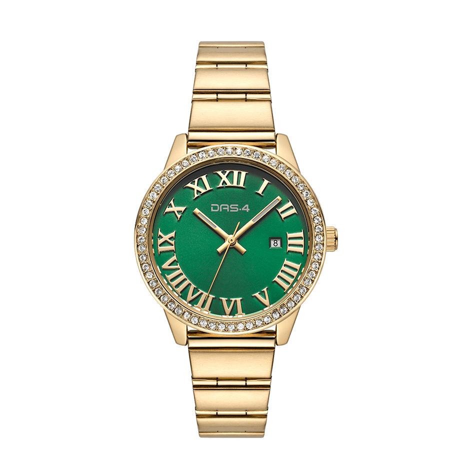 DAS.4 Γυναικείο Αναλογικό Ρολόι 2031100942, με πράσινο καντράν και στολισμένη κίτρινη χρυσή κάσα με λευκά ζιργκόν. Στο καντράν του, οι ενδείξεις τις ώρας απεικονίζονται με λατινικούς αριθμούς, ενώ υπάρχει ξεχωριστή ένδειξη της ημερομηνίας, και το μπρασελέ του είναι από ανοξείδωτο ατσάλι σε κίτρινο χρυσό επιμετάλλωση, DAS.4.