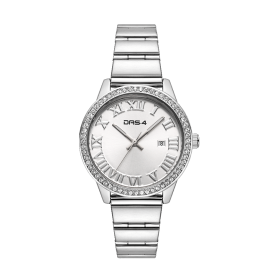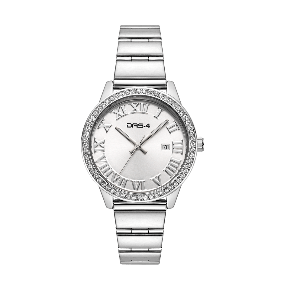 DAS.4 Γυναικείο Αναλογικό Ρολόι 2031100981, με ασημί καντράν και στολισμένη κάσα με λευκά ζιργκόν. Στο καντράν του, οι ενδείξεις τις ώρας απεικονίζονται με λατινικούς αριθμούς, ενώ υπάρχει ξεχωριστή ένδειξη της ημερομηνίας, και το μπρασελέ του είναι από ανοξείδωτο ατσάλι σε ασημί χρώμα, DAS.4.