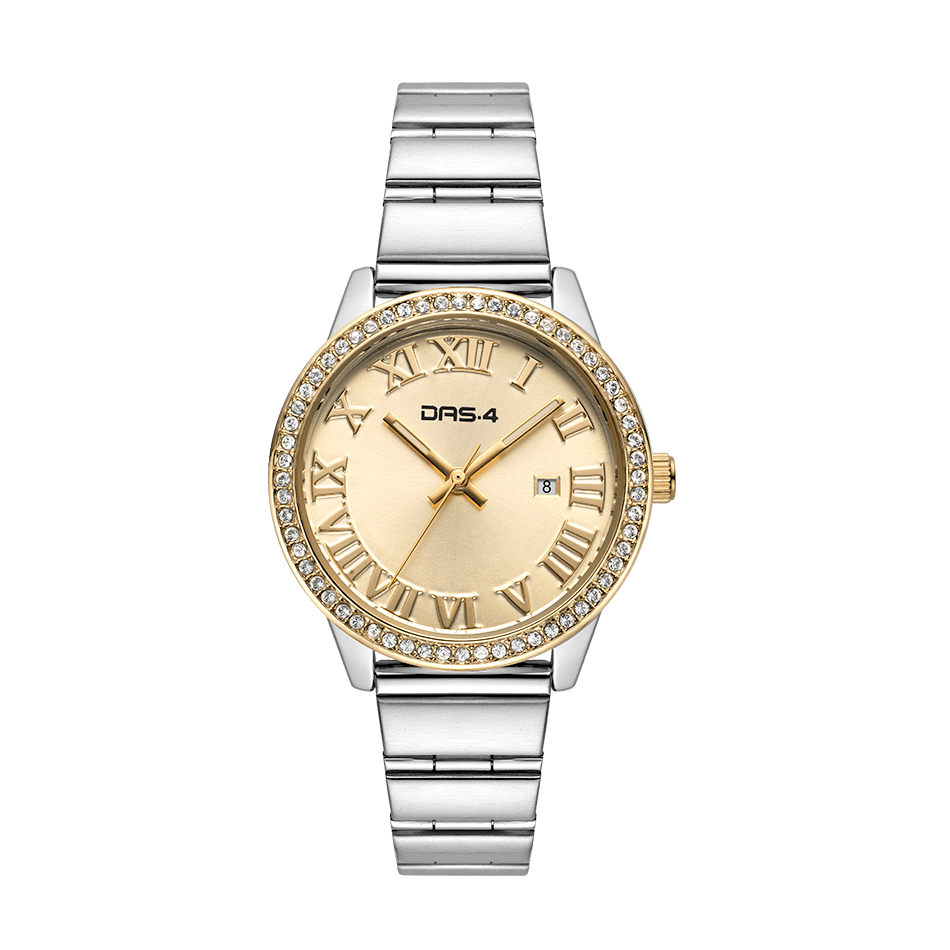 DAS.4 Γυναικείο Αναλογικό Ρολόι 2031100982, με σαμπανί καντράν και στολισμένη κίτρινη χρυσή κάσα με λευκά ζιργκόν. Στο καντράν του, οι ενδείξεις τις ώρας απεικονίζονται με λατινικούς αριθμούς, ενώ υπάρχει ξεχωριστή ένδειξη της ημερομηνίας, και το μπρασελέ του είναι από ανοξείδωτο ατσάλι σε ασημί χρώμα, DAS.4.
