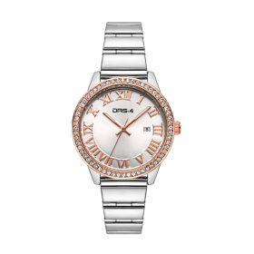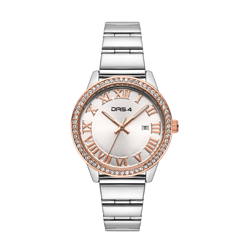 DAS.4 Γυναικείο Αναλογικό Ρολόι 2031100983, με ασημί καντράν και στολισμένη ροζ χρυσή κάσα με λευκά ζιργκόν. Στο καντράν του, οι ενδείξεις τις ώρας απεικονίζονται με λατινικούς αριθμούς, ενώ υπάρχει ξεχωριστή ένδειξη της ημερομηνίας, και το μπρασελέ του είναι από ανοξείδωτο ατσάλι σε ασημί χρώμα, DAS.4.