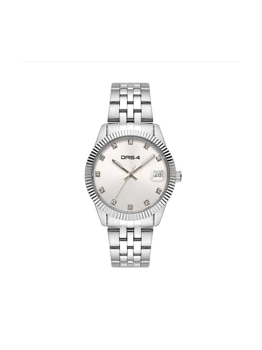 DAS.4 Γυναικείο Αναλογικό Ρολόι 2031101081, με ασημί χρώμα καντράν, διαμανταρισμένης επεξεργασίας κάσα και μπρασελέ από ανοξείδωτο ατσάλι σε ασημί χρώμα. Οι ενδείξεις της ώρα απεικονίζονται με λευκά ζιργκόν, ενώ υπάρχει ξεχωριστή ένδειξη της Ημερομηνίας, DAS.4.