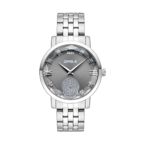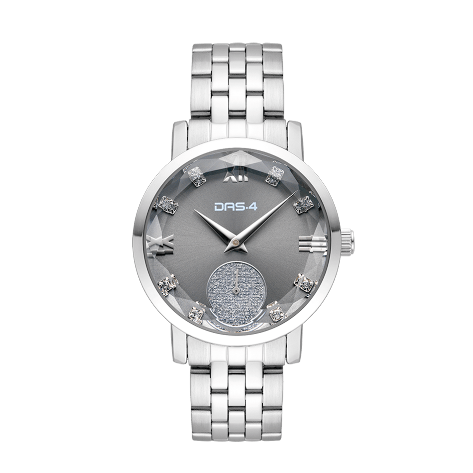 DAS.4 Γυναικείο Αναλογικό Ρολόι 2031101282, με σκούρο γκρι χρώμα καντράν, διαμανταρισμένης επεξεργασίας κάσα και μπρασελέ από ανοξείδωτο ατσάλι σε ασημί χρώμα. Οι κεντρικές ενδείξεις τις ώρας είναι με λατινικούς αριθμούς ενώ οι υπόλοιπες απεικονίζονται με ζιργκόν. Υπάρχει επίσης ξεχωριστή ένδειξη δευτερολέπτου σε πλαίσιο με ασημί glitter, DAS.4.