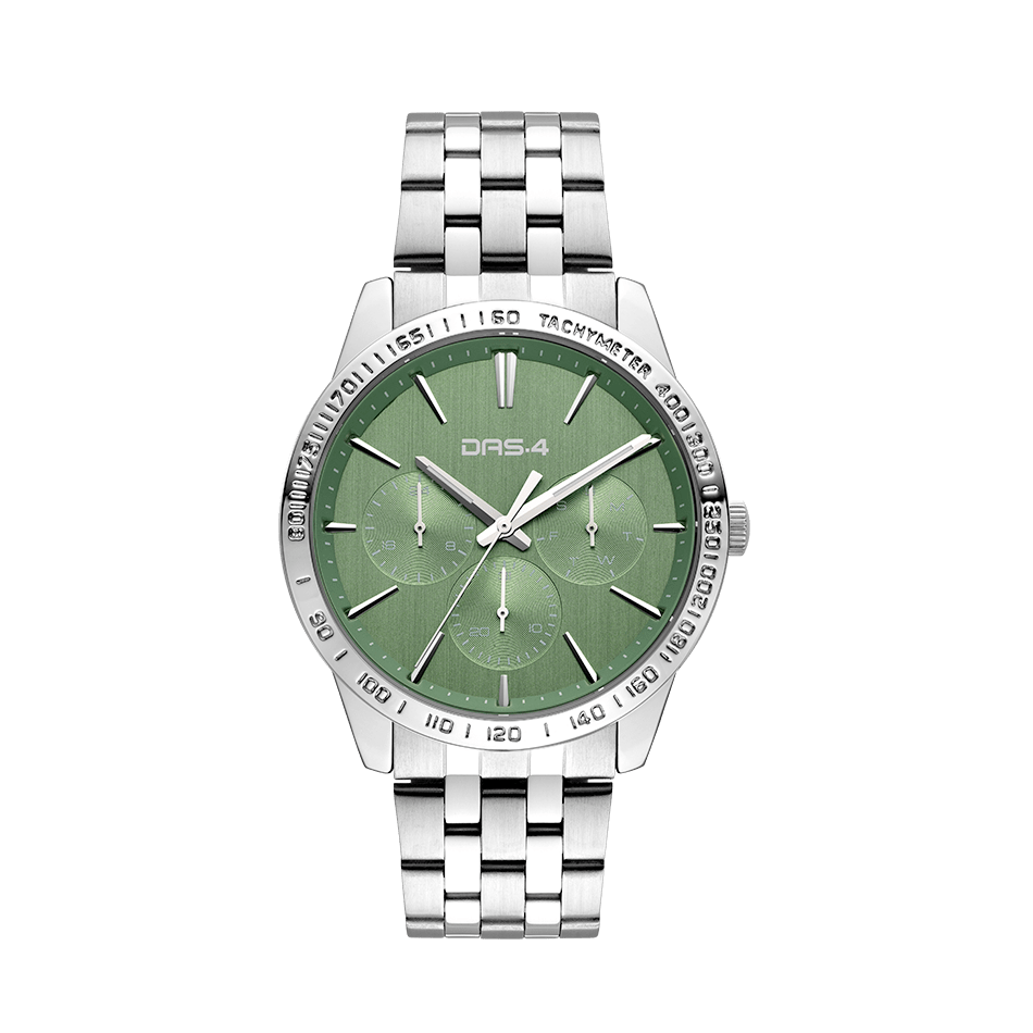 DAS.4 Ανδρικό Αναλογικό Ρολόι 2031350182, με πράσινο χρώμα καντράν και ασημί μπρασελέ από ανοξείδωτο ατσάλι. Στο εσωτερικό μέρος του καντράν υπάρχουν ξεχωριστές ενδείξεις Ημέρας, Ημερομηνίας και 24ωρης ώρας, σε πράσινο πλαίσιο, DAS.4.