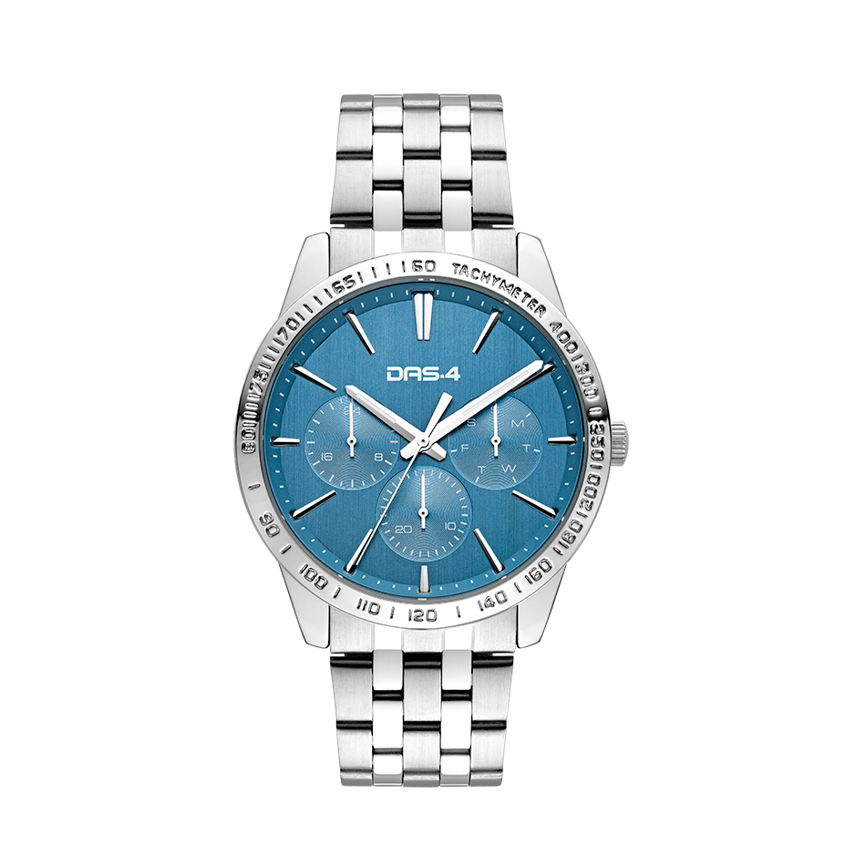 DAS.4 Ανδρικό Αναλογικό Ρολόι 2031350183, με μπλε χρώμα καντράν και ασημί μπρασελέ από ανοξείδωτο ατσάλι. Στο εσωτερικό μέρος του καντράν υπάρχουν ξεχωριστές ενδείξεις Ημέρας, Ημερομηνίας και 24ωρης ώρας, σε μπλε πλαίσιο, DAS.4.