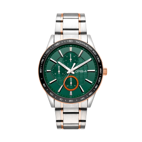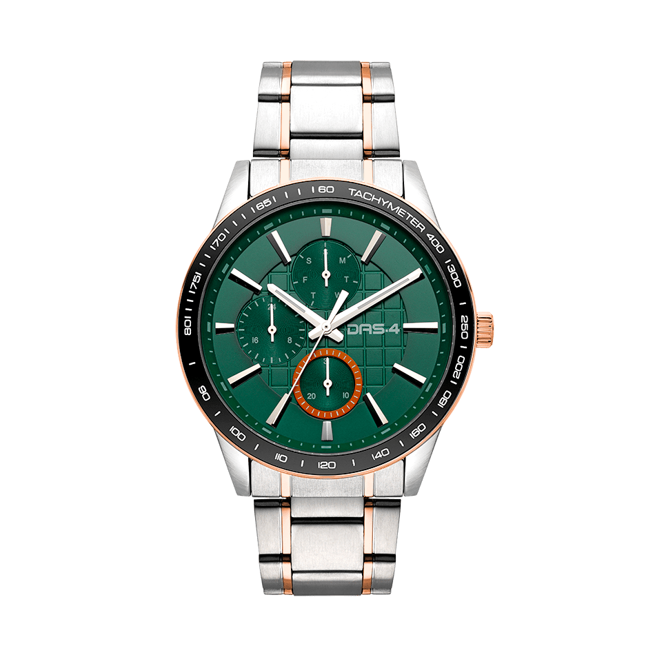 DAS.4 Ανδρικό Αναλογικό Ρολόι 2031350271, με πράσινο χρώμα καντράν και δίχρωμο μπρασελέ από ανοξείδωτο ατσάλι σε ροζ χρυσό επιμετάλλωση. Στο εσωτερικό μέρος του καντράν υπάρχουν ξεχωριστές ενδείξεις Ημέρας, 24ωρης ώρας και Ημερομηνίας σε πορτοκαλί πλαίσιο, DAS.4.
