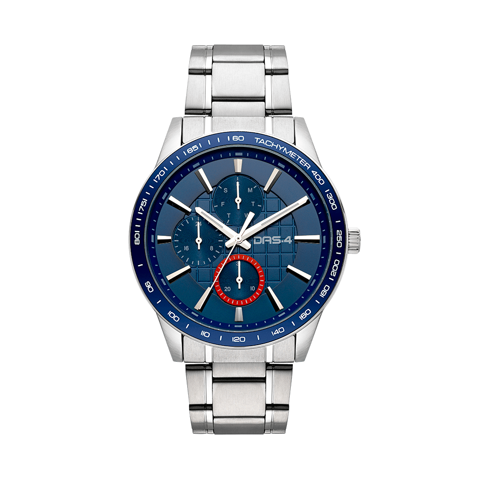 DAS.4 Ανδρικό Αναλογικό Ρολόι 2031350282, με navy μπλε χρώμα καντράν και μπρασελέ από ανοξείδωτο ατσάλι σε ασημί χρώμα. Στο εσωτερικό μέρος του καντράν υπάρχουν ξεχωριστές ενδείξεις Ημέρας, 24ωρης ώρας και Ημερομηνίας σε κόκκινο πλαίσιο, DAS.4.