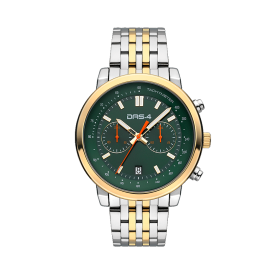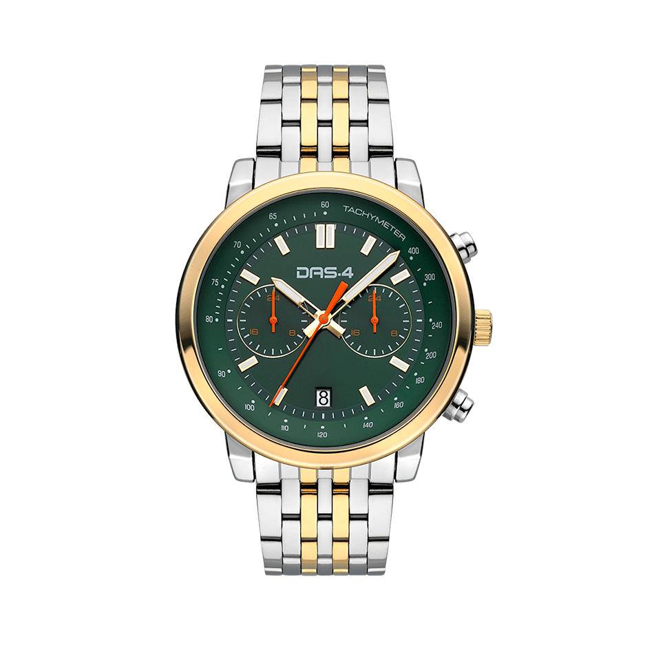 DAS.4 Ανδρικό Αναλογικό Ρολόι 2031350461, με πράσινο χρώμα καντράν και δίχρωμο μπρασελέ από ανοξείδωτο ατσάλι σε κίτρινο χρυσό επιμετάλλωση. Στο εσωτερικό μέρος του καντράν υπάρχουν ξεχωριστές ενδείξεις Ημέρας και 24ωρης ώρας με πορτοκαλί λεπτομέρειες, DAS.4.