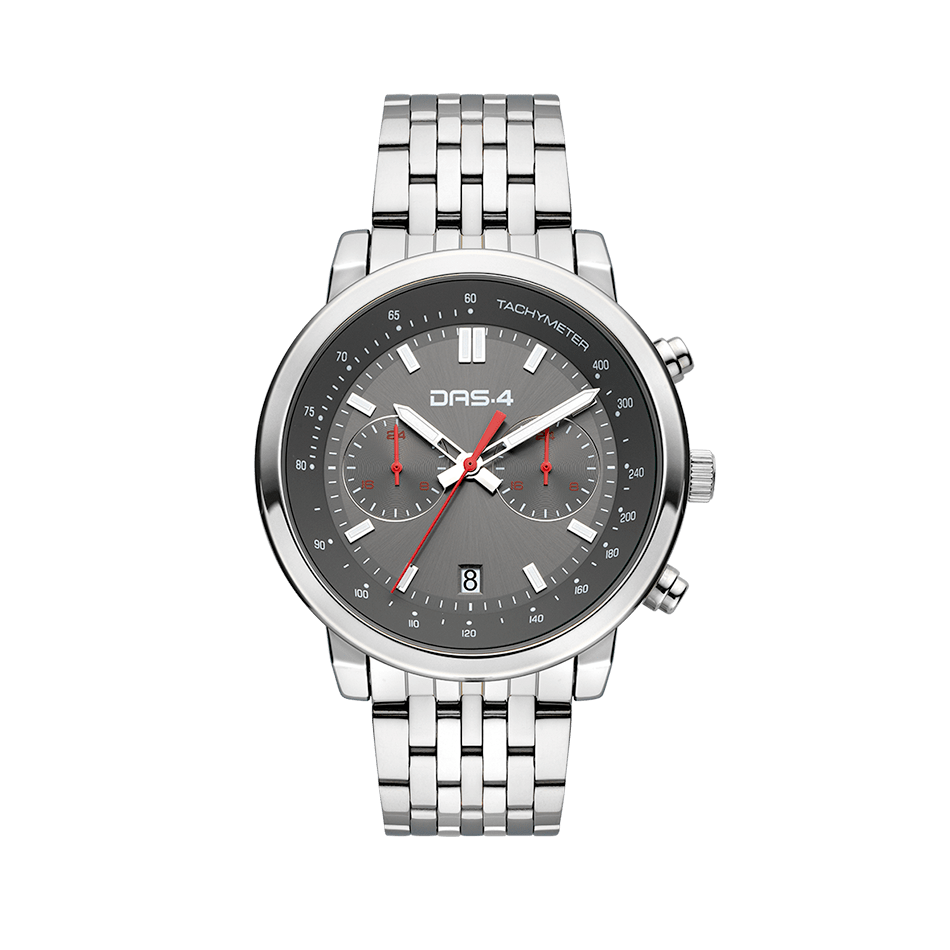 DAS.4 Ανδρικό Αναλογικό Ρολόι 2031350481, με σκούρο γκρι χρώμα καντράν και μπρασελέ από ανοξείδωτο ατσάλι σε ασημί χρώμα. Στο εσωτερικό μέρος του καντράν υπάρχουν ξεχωριστές ενδείξεις Ημέρας και 24ωρης ώρας με πορτοκαλί λεπτομέρειες, DAS.4.