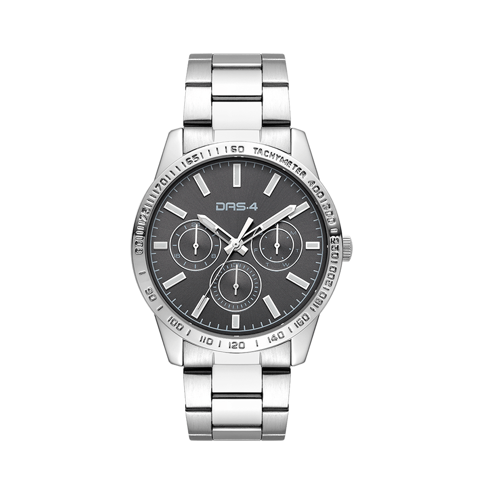 DAS.4 Ανδρικό Αναλογικό Ρολόι 2031350781, με σκούρο γκρι χρώμα καντράν και μπρασελέ από ανοξείδωτο ατσάλι σε ασημί χρώμα. Στο εσωτερικό μέρος του καντράν υπάρχουν ξεχωριστές ενδείξεις Ημέρας, Ημερομηνίας και 24ωρης ώρας με λεπτομέρειες σε ασημί, DAS.4.