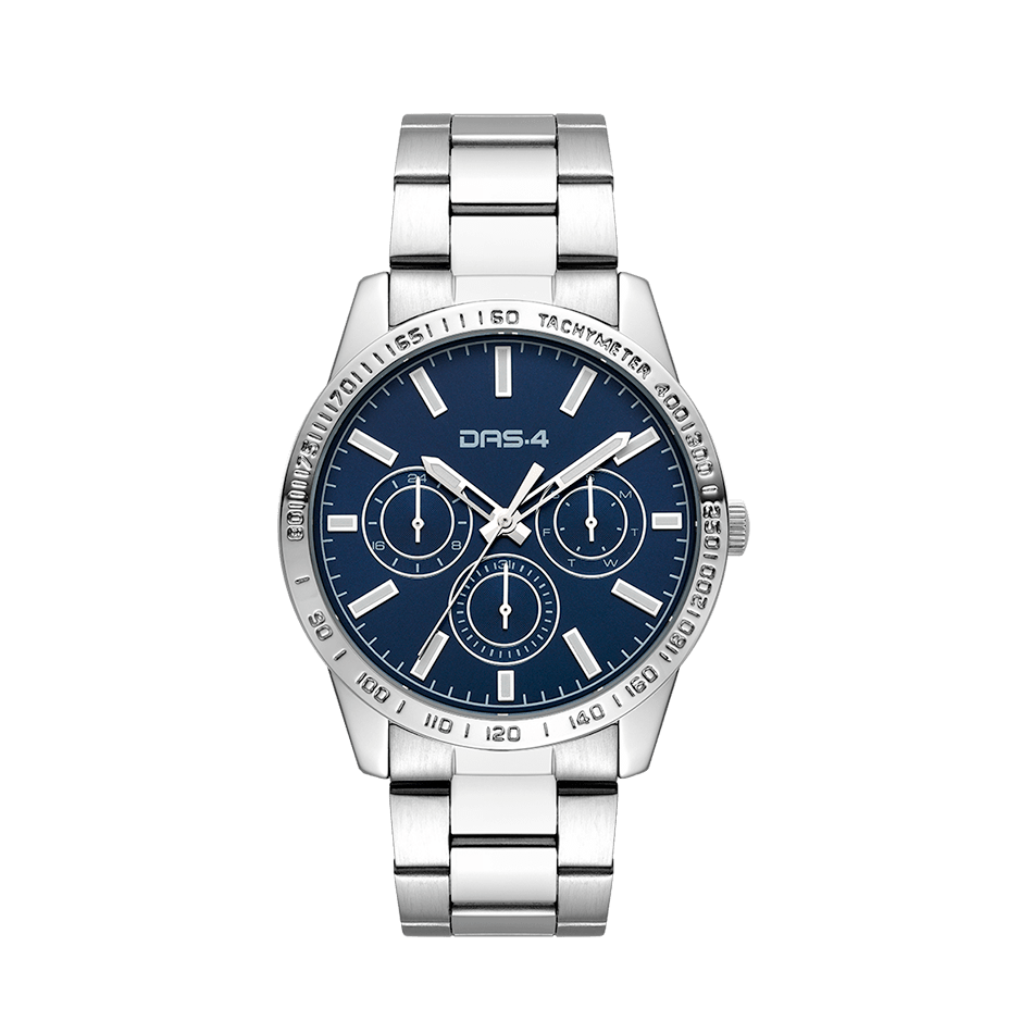 DAS.4 Ανδρικό Αναλογικό Ρολόι 2031350782, με navy μπλε χρώμα καντράν και μπρασελέ από ανοξείδωτο ατσάλι σε ασημί χρώμα. Στο εσωτερικό μέρος του καντράν υπάρχουν ξεχωριστές ενδείξεις Ημέρας, Ημερομηνίας και 24ωρης ώρας με λεπτομέρειες σε ασημί, DAS.4.