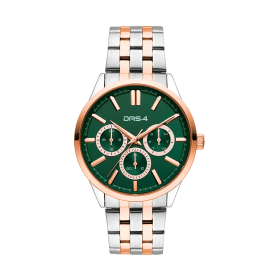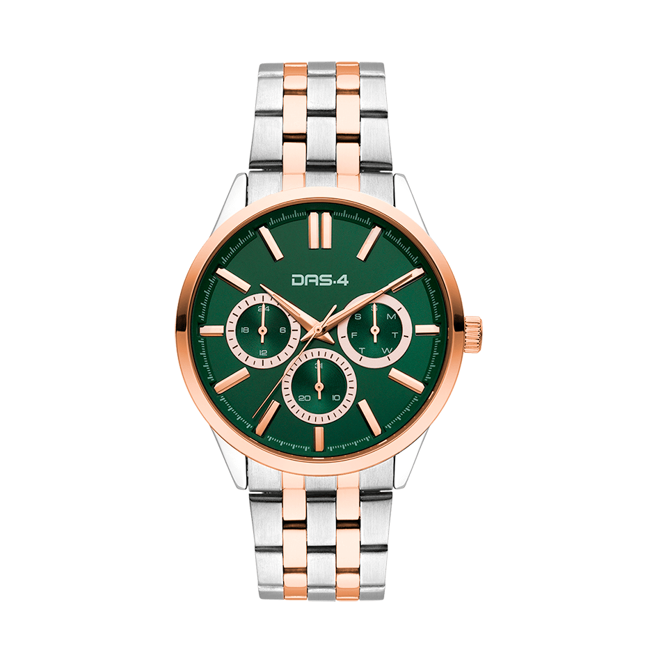 DAS.4 Ανδρικό Αναλογικό Ρολόι 2031350971, με πράσινο χρώμα καντράν και μπρασελέ από ανοξείδωτο ατσάλι σε ροζ χρυσό επιμετάλλωση. Στο εσωτερικό μέρος του καντράν υπάρχουν ξεχωριστές ενδείξεις Ημέρας, Ημερομηνίας και 24ωρης ώρας σε ροζ χρυσό πλαίσιο, DAS.4.