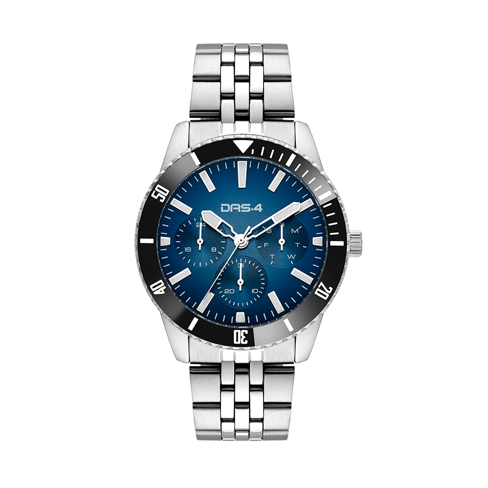 DAS.4 Ανδρικό Αναλογικό Ρολόι 2031351083, με navy μπλε χρώμα καντράν και μπρασελέ από ανοξείδωτο ατσάλι σε ασημί χρώμα. Στο καντράν υπάρχει διακοσμητική στεφάνη ταχυμέτρου σε μαύρο χρώμα, ενώ στο εσωτερικό μέρος του καντράν υπάρχουν ξεχωριστές ενδείξεις Ημέρας, Ημερομηνίας και 24ωρης ώρας με λεπτομέρειες σε ασημί χρώμα, DAS.4.