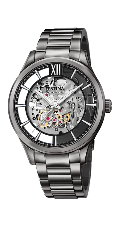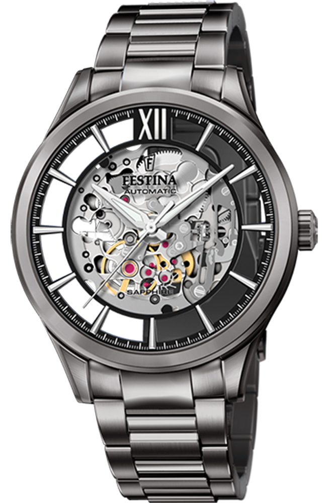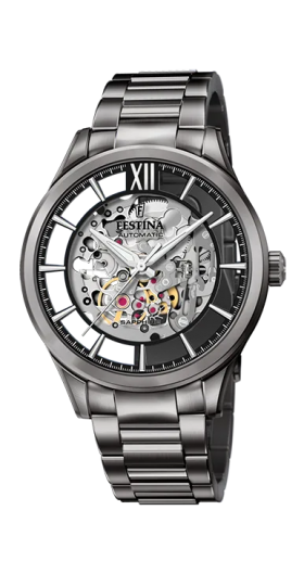 Αυτόματο Ρολόι Festina Skeleton με ανθρακί ατσάλινο μπρασελέ και μηχανή Miyota 8215 CWMJ.