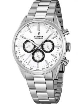 Ανδρικό ρολόι χρονογράφος της εταιρίας Festina, μεγάλου μεγέθους με μεταλλικό μπρασελέ σε ασημί χρώμα. Διαθέτει μηχανισμό μπαταρίας, ο οποίος βασίζεται στην ηλεκτρική ενέργεια που παρέχει η μπαταρία, με αποτέλεσμα να υπάρχει ακρίβεια και αντοχή. Είναι ανθεκτικό στο πλύσιμο των χεριών ενώ είναι ακατάλληλο για κολύμβηση (5 atm/50 μέτρα).
