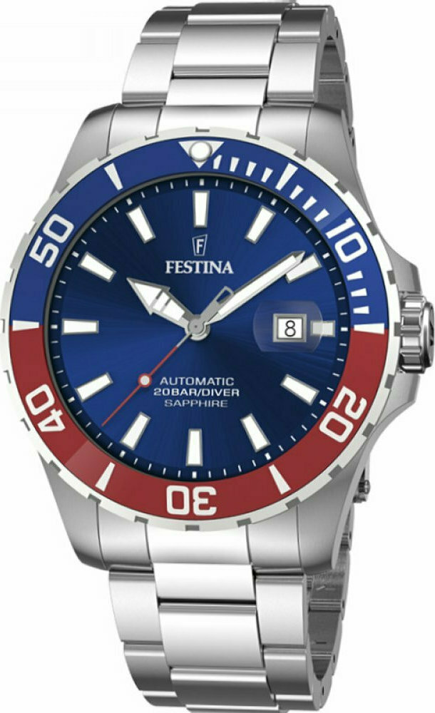 Ανδρικό ρολόι της εταιρίας Festina, μεγάλου μεγέθους με μεταλλικό μπρασελέ σε ασημί χρώμα. Διαθέτει αυτόματο μηχανισμό που επιτρέπει να αποφεύγεται το χειροκίνητο κούρδισμα, καθώς αυτό επιτυγχάνεται με την κίνηση του χεριού περιστρέφοντας έναν ρότορα ο οποίος συσπειρώνει το ελατήριο.
