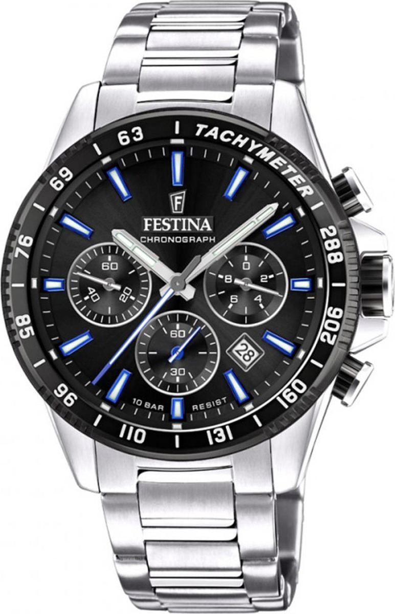 Ανδρικό ρολόι χρονογράφος της εταιρίας Festina. Διαθέτει μηχανισμό μπαταρίας, ο οποίος βασίζεται στην ηλεκτρική ενέργεια που παρέχει η μπαταρία, με αποτέλεσμα να υπάρχει ακρίβεια και αντοχή. Είναι ανθεκτικό στο νερό έως 100 μέτρα και είναι ιδανικό για κολύμπι (10 atm).