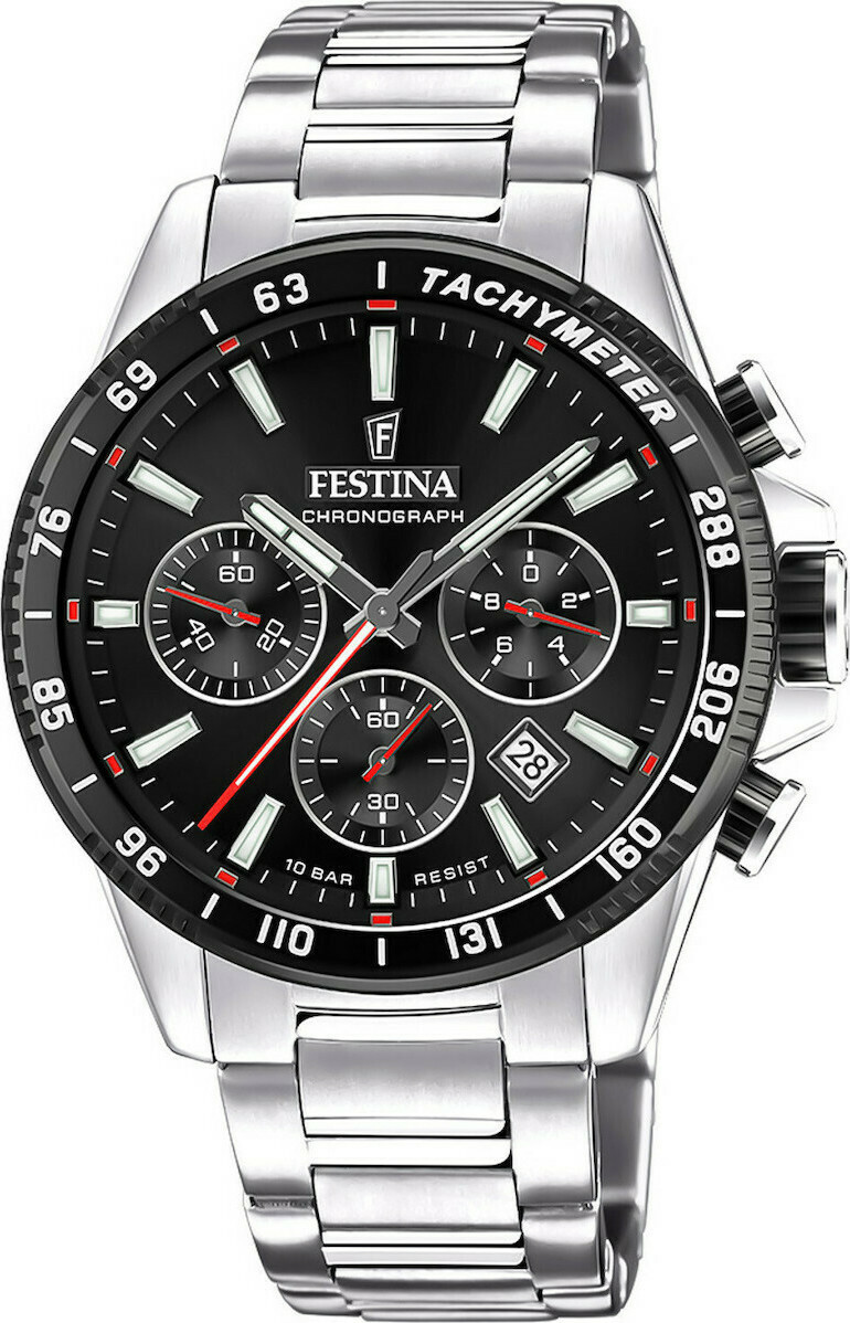 Ανδρικό ρολόι χρονογράφος της εταιρίας Festina. Διαθέτει μηχανισμό μπαταρίας, ο οποίος βασίζεται στην ηλεκτρική ενέργεια που παρέχει η μπαταρία, με αποτέλεσμα να υπάρχει ακρίβεια και αντοχή. Είναι ανθεκτικό στο νερό έως 100 μέτρα και είναι ιδανικό για κολύμπι (10 atm).