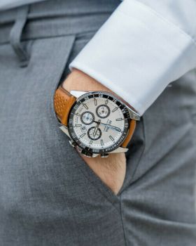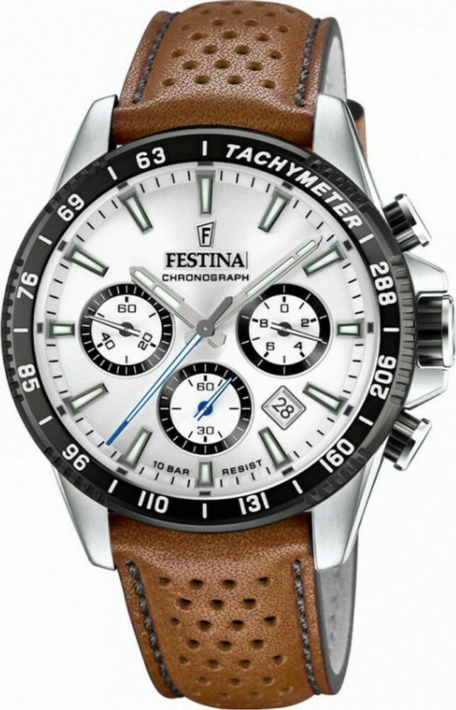 Ανδρικό ρολόι μπαταρίας της εταιρείας Festina με καφέ δερμάτινο λουράκι.