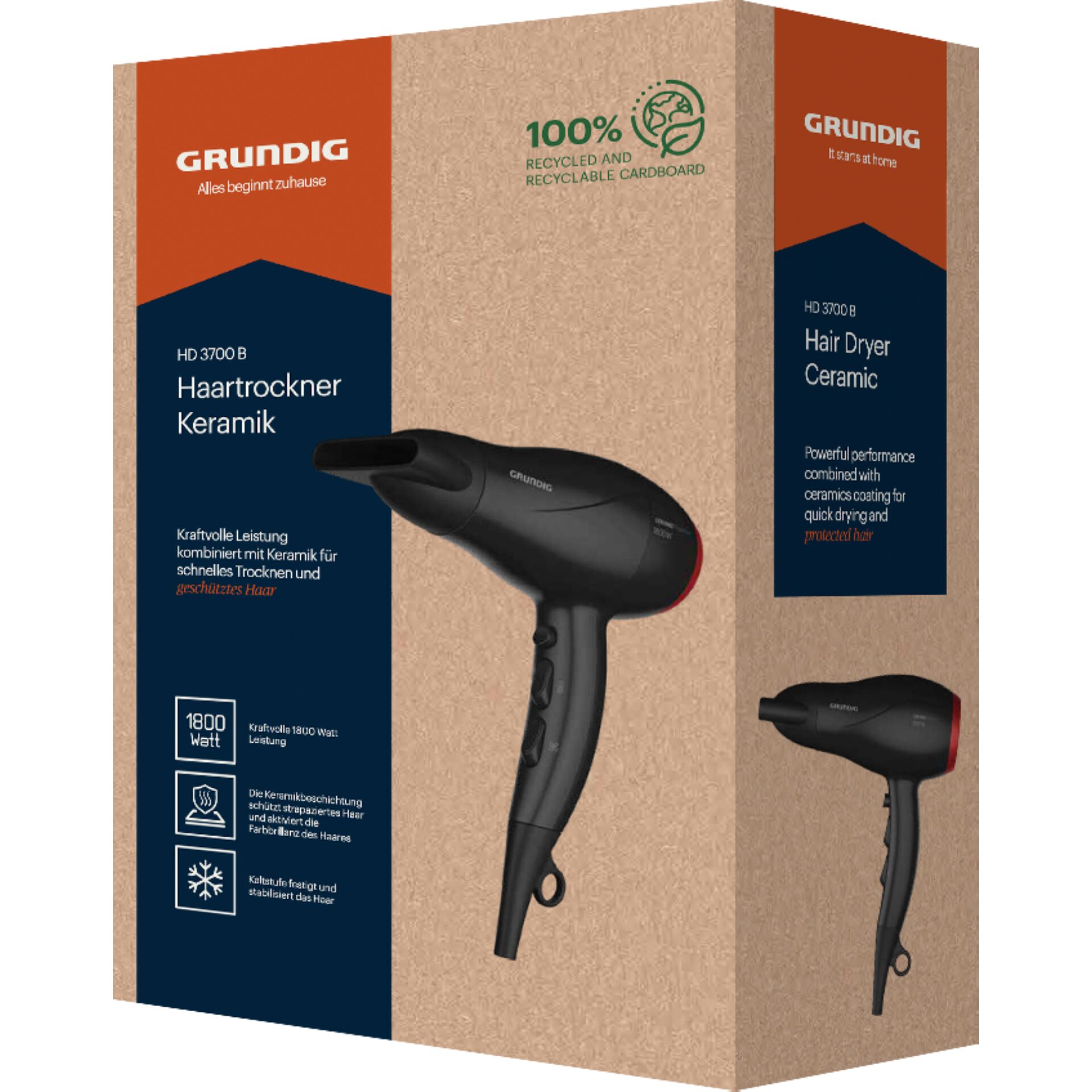 Thanks to its lightweight and compact design, the Grundig HD 3700 B hairdryer is ideal for everyday use and especially when travelling. With several settings and a styling nozzle included, it contains everything you need for perfectly styled hair. The nozzle grid has a ceramic coating, which protects the hair from overheating. The Grundig HD 3700 B hairdryer is an excellent choice for anyone looking for a reliable and affordable hairdryer that is also gentle on the hair.