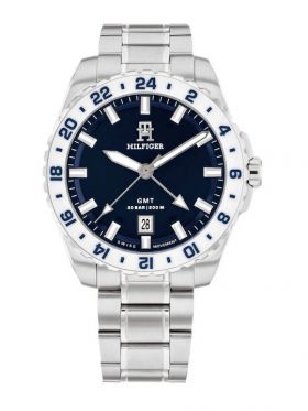 Ανδρικό ρολόι Tommy Hilfiger από ανοξείδωτο ατσάλι με μπλε καντράν και ασημί μπρασελέ.