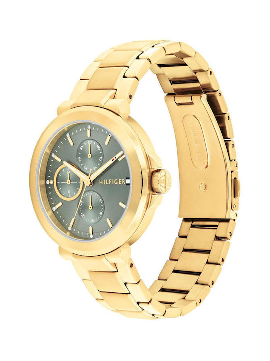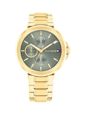 Γυναικείο ρολόι από την εταιρία Tommy Hilfiger. Το στρογγυλό καντράν, με το μεταλλικό μπρασελέ σε χρυσό χρώμα και τις διακοσμητικές πέτρες, κάνουν το ρολόι ιδανικό για καθημερινές άλλα και πιο επίσημες εμφανίσεις. Διαθέτει μηχανισμό μπαταρίας, ο οποίος βασίζεται στην ηλεκτρική ενέργεια που παράγει η μπαταρία, με αποτέλεσμα να υπάρχει ακρίβεια και αντοχή.