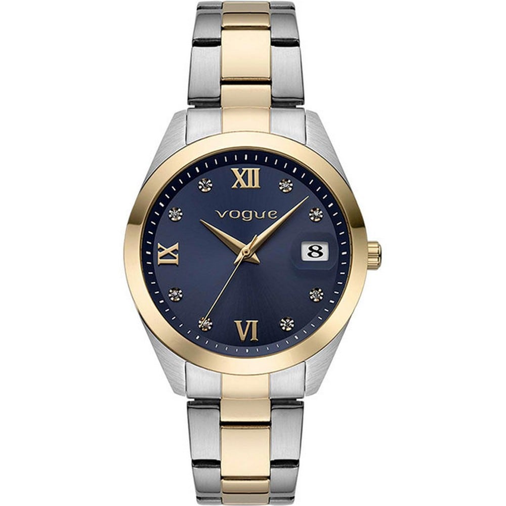 Γυναικείο ρολόι Vogue από τη σειρά “Amelie” με πλαίσιο και μπρασελέ από δίχρωμο ανοξείδωτο ατσάλι και μπλε κατράν διακοσμημένο με κρύσταλλα. Ο μηχανισμός του διαθέτει ένδειξη ημερομηνίας με παράθυρο στη θέση 3.